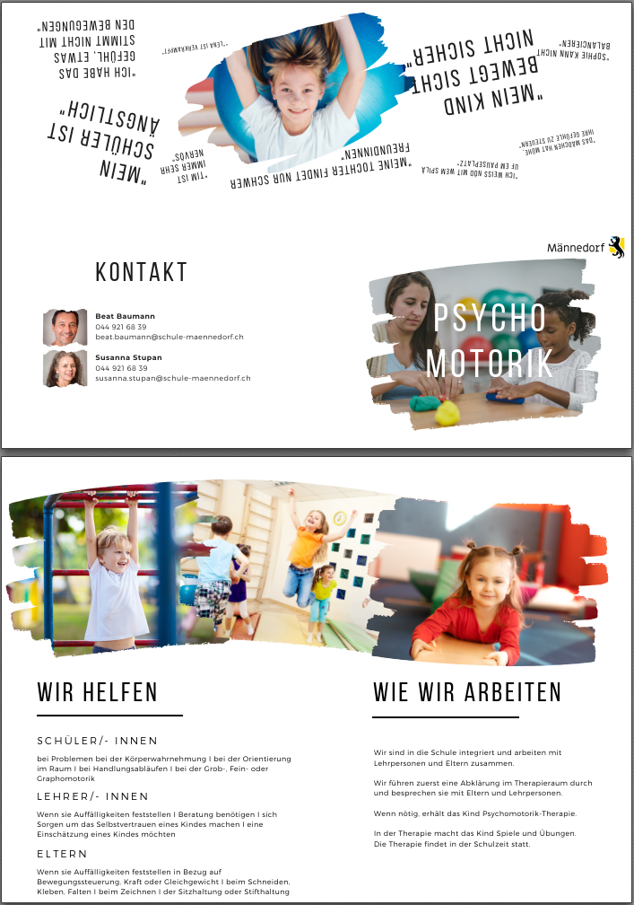 Hier finden Sie den Flyer zum Angebot Psychomotorik der Schule Männedorf. Weiterführende Informationen zum sonderpädagogischen Angebot: Volksschulamt, Sonderpädagogisches